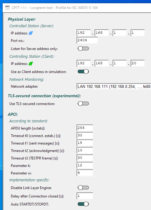 (2.20.6) Alle Fenster nutzen jetzt wenn sinnvoll Schiebeschalter zum Ein-/Ausschalten von Funktionen. Hier zwei Beispiele: Das Fenster für das IEC 60870-5-104-Profil: