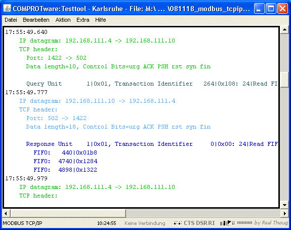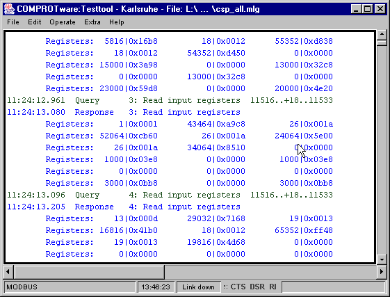 Die verlinkte MODBUS serial-MLG-Datei ist sehr groß, sie umfasst mehr als 1.100.000 Telegramme. Wir wollen mit dieser Datei zeigen, dass CPTT problemlos mit umfangreichen Protokollmitschnitten zurechtkommt.